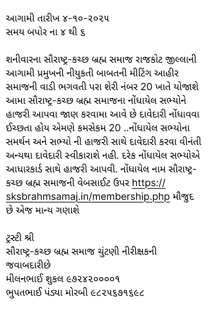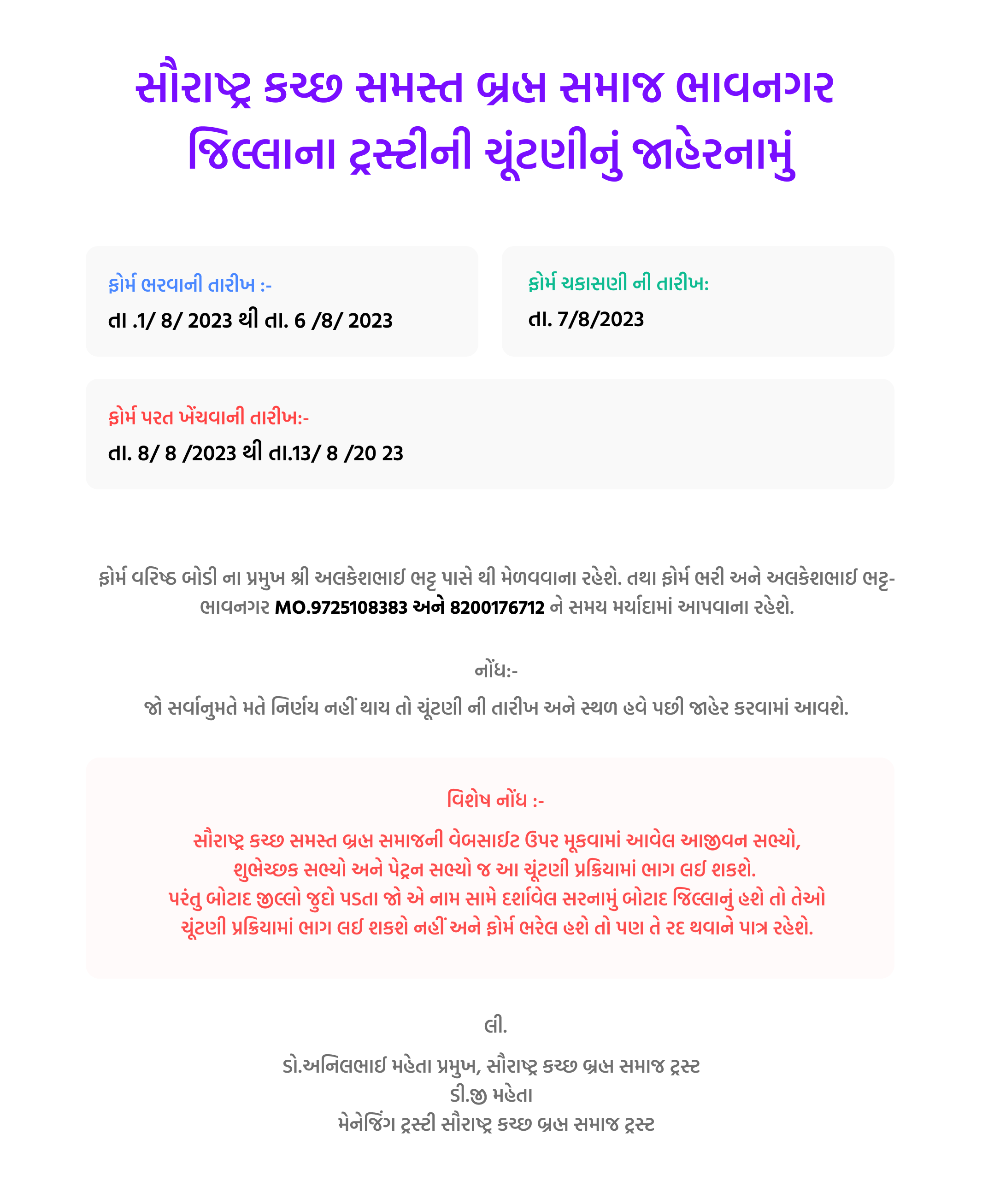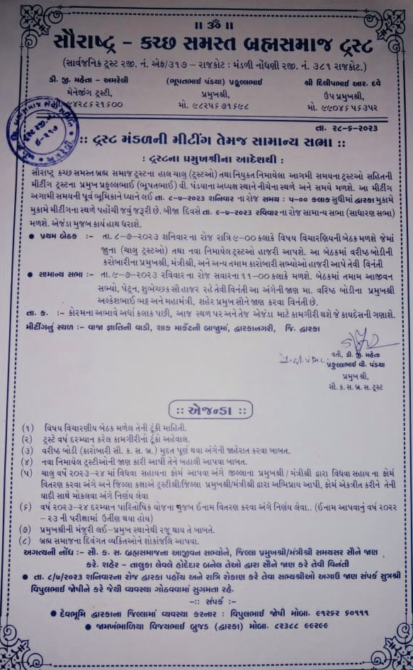 Shri Saurashtra kutch samast Brahmasamaj is such an established name in Saurashtra & Kutch region that most of samast brahmans are well known about the organization. For 38 years the organization works hard for society. Holders with executive authority of various divisions of Shri Saurashrashtra Kutch Samast Brahmsamaj and other various brahmins caste-related organizations who work in 12 districts in Saurashtra and Kutch region.